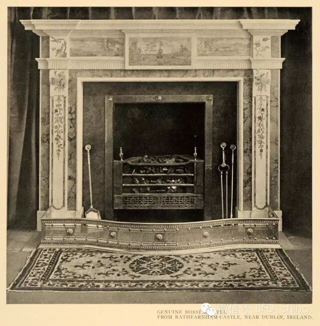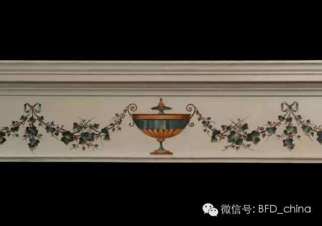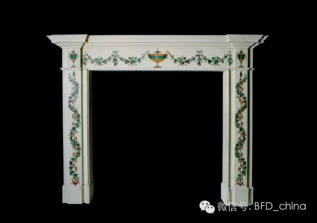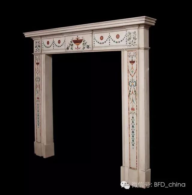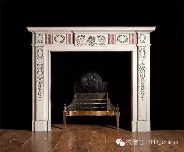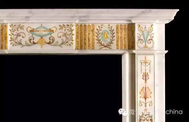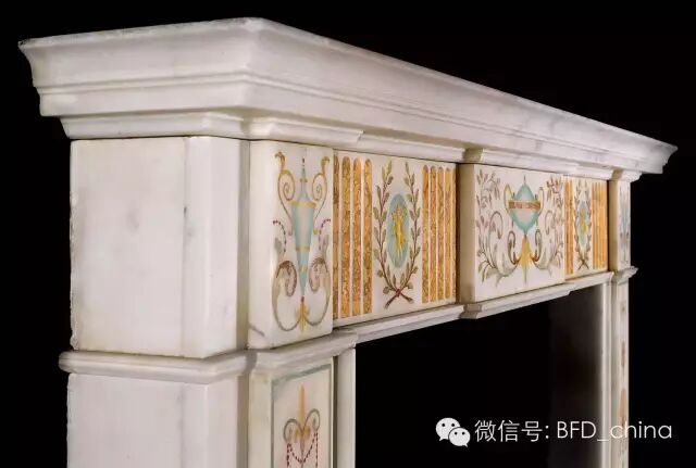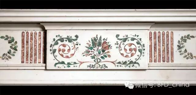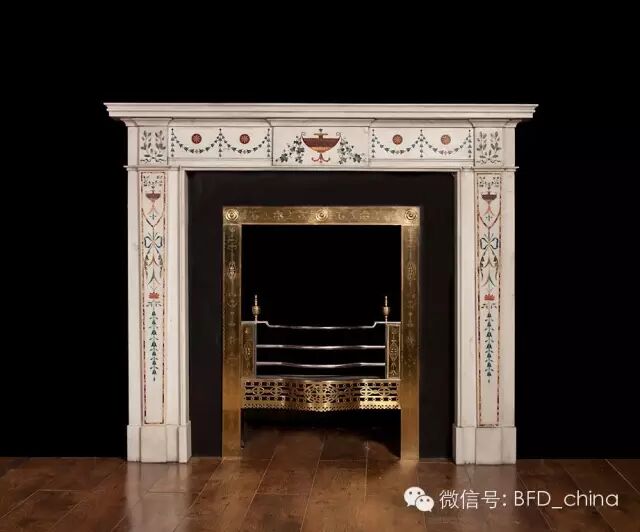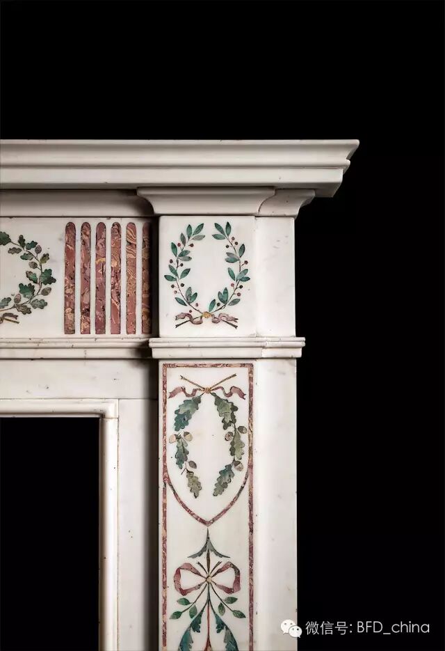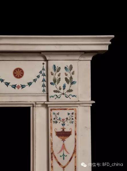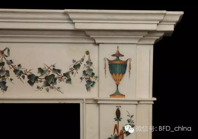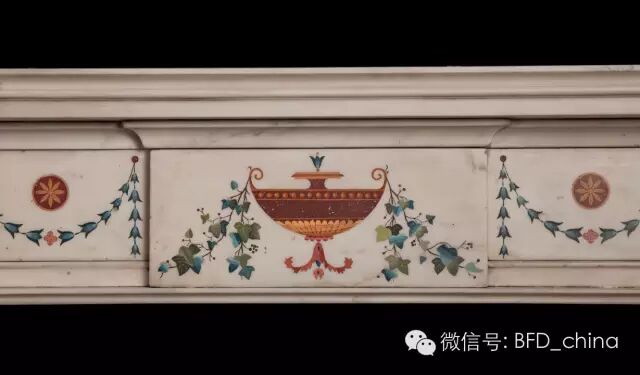 以上组图是一款镶嵌着精美图案的意大利新古典主义壁炉架,有着 埃特罗·博西 的风格,这款古董壁炉架的柱脚上镶嵌着阿拉伯式花纹的仿云石。中间的镶嵌板上描绘的是西班牙花锻式长笛和被花卉包裹着的水瓮。在都柏林圣斯蒂芬大道86号公寓内,一个18世纪新古典主义壁炉与此款壁炉有着十分相似的细节。