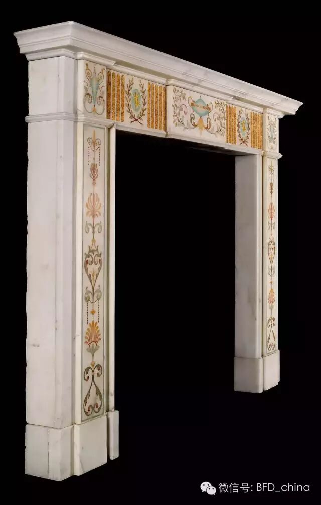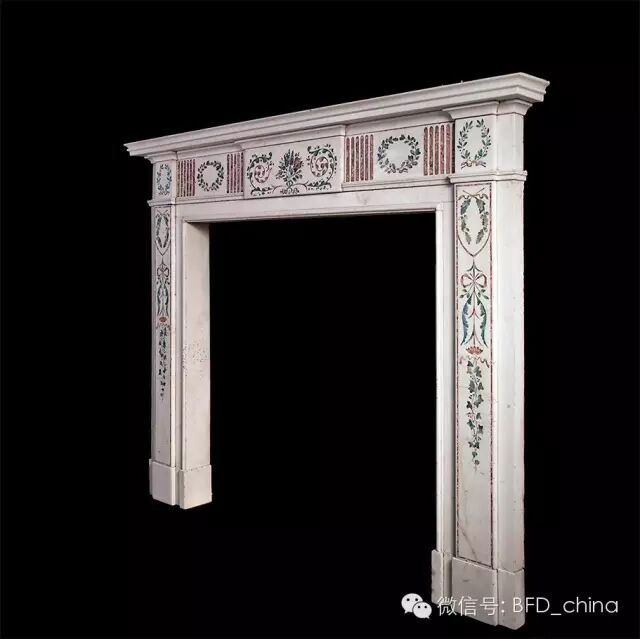 爱尔兰 乔治亚时期 埃特罗·博西壁炉 白色斯塔特大理石和仿云石壁炉架,优良的品质,精美的彩色仿云石,排列有序的镶嵌,有着伊特鲁里亚和古城庞贝的风格。