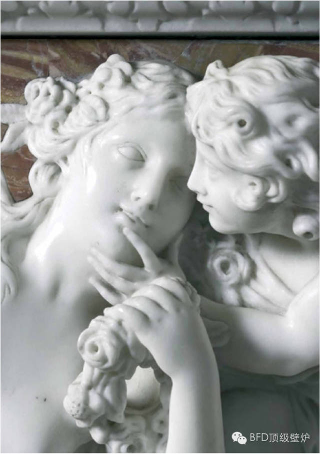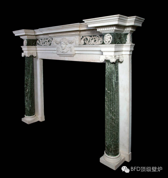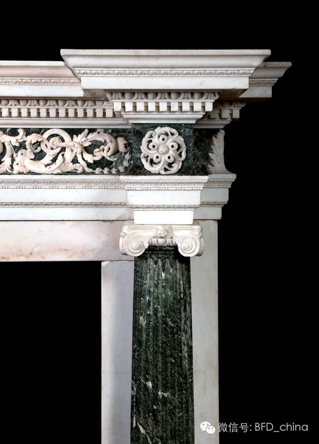 Isaac Ware(1704-1766)结合STAT白色大理石和Verde Antico绿色大理石纹理质地设计而成的。由Verde Antico大理石为基底配以STAT大理石雕刻的流畅花纹而成的中部横梁板。中部凸出的中心板描绘出春天的花之女神、橡树叶和果实的礼物,一股春天的气息扑面而来。