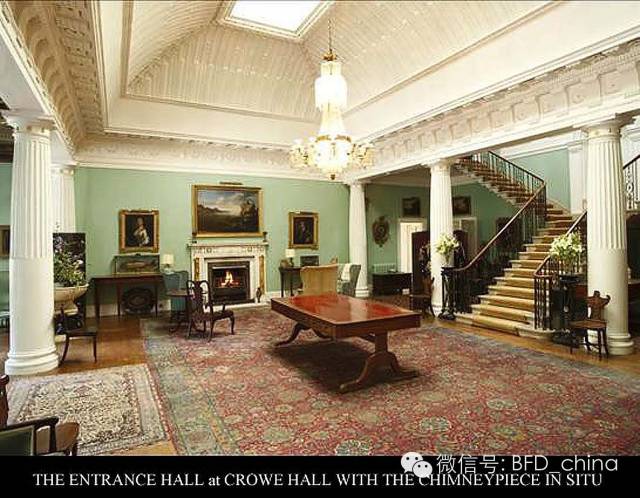 壁炉来自克罗庄园,一座乔治三世时期的建筑。位置在英格兰巴斯城附近,这个庄园由Brigadier Crowe始建于1780年,1926年在一场严重的火灾后被精心修复,二战期间这里被海军征用,1961年被Sydney Barratt爵士够得,作为其私家庄园。