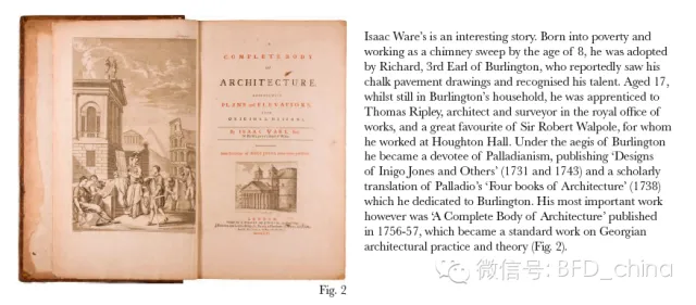 设计师艾萨克·威尔(Isaac Ware)的经历是一个有趣的故事。他出身贫困,8 岁做了壁炉清洁工,后来被伯灵顿伯爵三世李察收养,建筑师兼赞助人伯灵顿伯爵是“英国帕拉迪奥主义运动”中最主要的赞助者和支持者。据说是伯爵看见他用粉笔画路面图纸并确认了他的天赋。17 岁的艾萨克·威尔,虽然仍住在伯灵顿伯爵的家里,但他已是皇家工程办公室的建筑师、测量师托马斯·里普利的学徒,和最喜欢的先生罗伯特沃·波尔的学生,他曾在霍顿霍尔。而艾萨克 ·威尔最重要的工作,即他的著作——《一个完整的主体建筑》于1756-1757 年出版,成为格鲁吉亚的建筑实践和理论的一个标准指南。