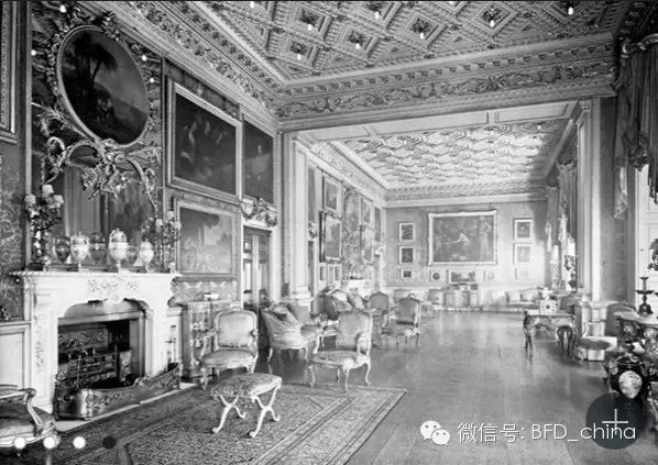 壁炉有着精美的雕工,镶嵌有带状的精致雕刻的板子中间展现的是一个花环缠绕的古典金杯,两侧站着两个女神。几乎同式样的镶嵌板可以在JAMES WYATT其他壁炉雕刻作品中看到,(如由Suffolk建于1799年的赫维宁汉庄园)。