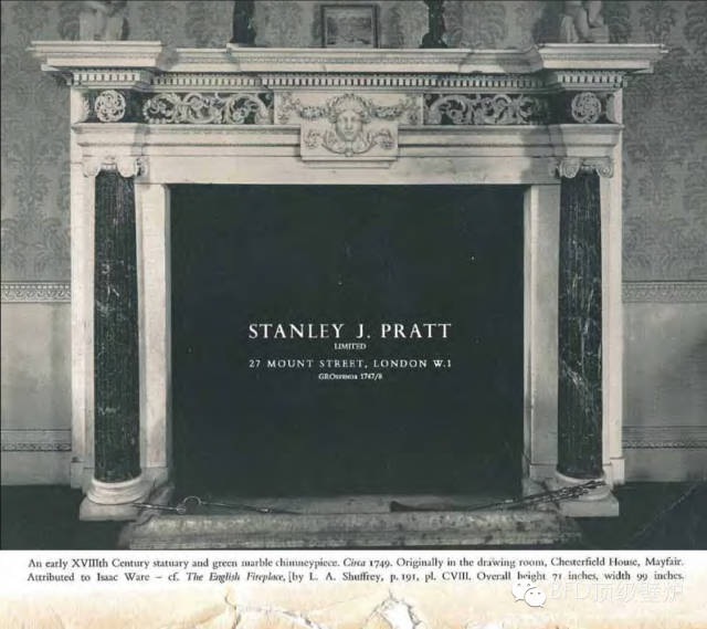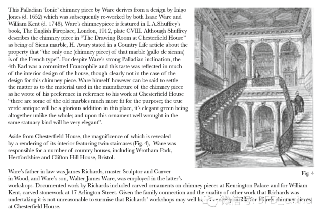 1963年Isaac Ware被刊登在著名的鉴赏家杂志上。杂志中讲道:一款十八世纪早期Stauary大理石壁炉。大约在1749年。最初见于梅费尔区切斯特菲尔德庄园的画室中,由Isaac Ware设计。