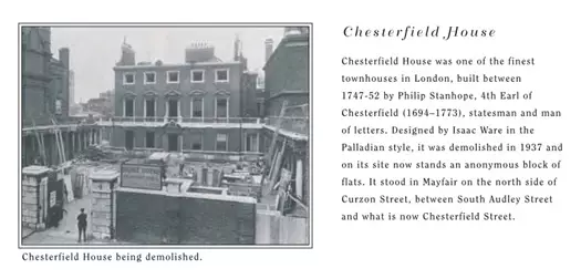 切斯特菲尔德庄园Chesterfield House是当时伦敦最精美华贵的庄园之一,是PhilipStanhope,即第四代切斯特菲尔德伯爵(1694—1773)于1747至1752年建造的。Isaac Ware设计的帕拉第奥风格建筑。曾于1937年被损毁,现今只留有大片的砖块及平地。它位于South Audley街和现在称之为Chesterfield街中间的Curzon街北部的梅费尔区。